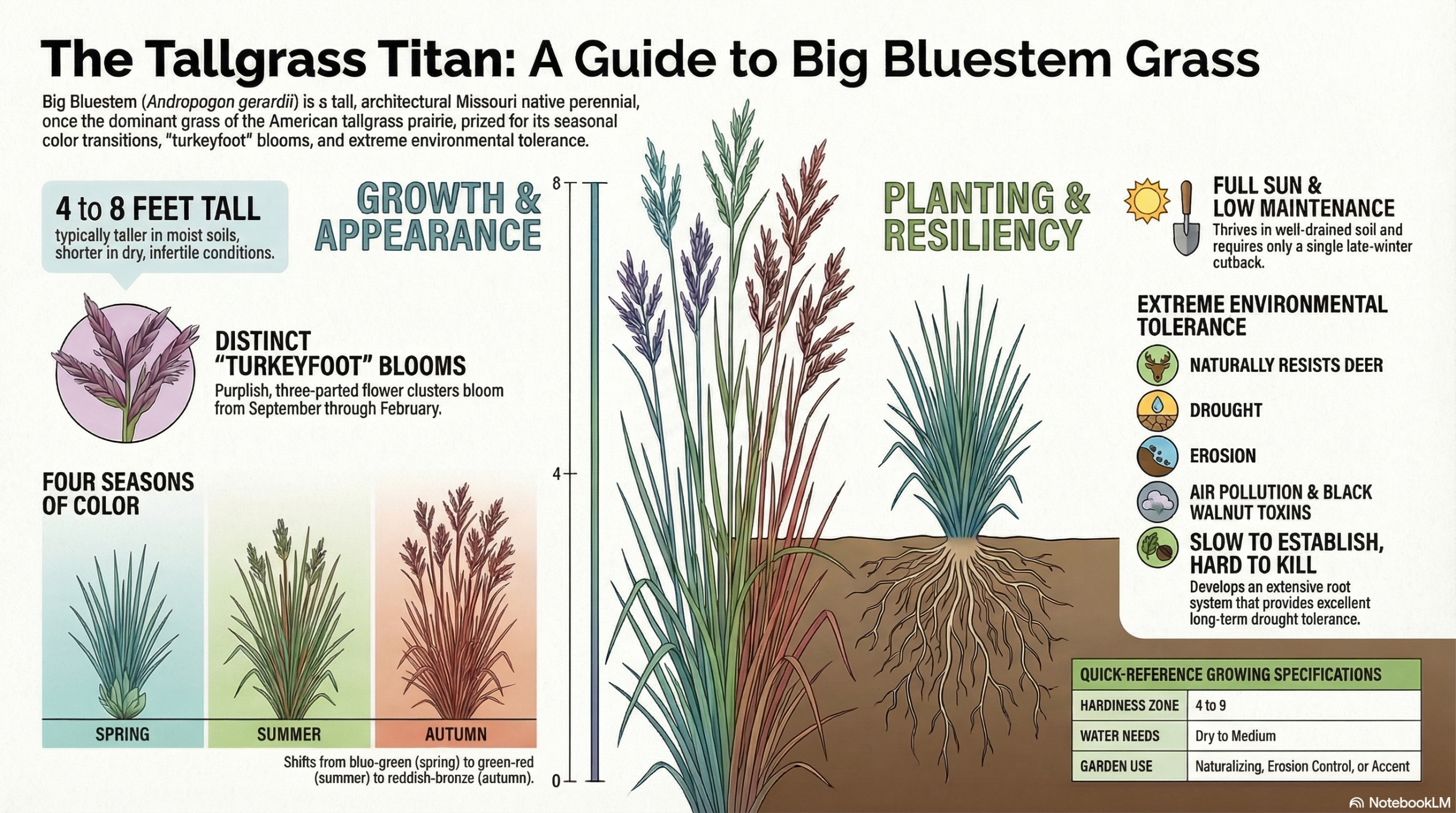Noteworthy Characteristics: Andropogon gerardii, commonly called big bluestem grass, is a tall, Missouri native, perennial, warm season grass that was the dominant grass of the tallgrass prairie which once covered large parts of the Midwest. It may be grown as an ornamental grass because of its attractive foliage which changes color seasonally, its good architectural height and its interesting flower/seed heads. It features an upright clump of stems with flattened leaves (to 2′ long and 3/8″ wide) which emerge gray to blue green in spring, mature to green with red tinges in summer and turn reddish bronze with lavender tones in autumn after frost. Flowering stems rise in late summer above the foliage clump bearing purplish 3-parted, finger-like flower clusters (to 4″ long) purportedly resembling turkey feet (hence the additional common name of turkeyfoot grass for this species). Flowering stems bring total height of this grass to 4-8′ tall (typically at the taller end in moist soils and the shorter end in dry soils).