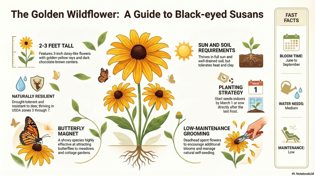 Noteworthy Characteristics: Rudbeckia hirta, commonly called black-eyed Susan, is a common  native wildflower which typically occurs in open woods, prairies, fields, roadsides and waste areas throughout the State. It is a coarse, hairy, somewhat weedy plant that features daisy-like flowers (to 3” across) with bright yellow to orange-yellow rays and domed, dark chocolate-brown center disks. Blooms throughout the summer atop stiff, leafy, upright stems growing 1-3’ tall. Rough, hairy, lance-shaped leaves (3-7” long). Plants of this species are sometimes commonly called gloriosa daisy, particularly the larger-flowered cultivars that come in shades of red, yellow, bronze, orange and bicolors.