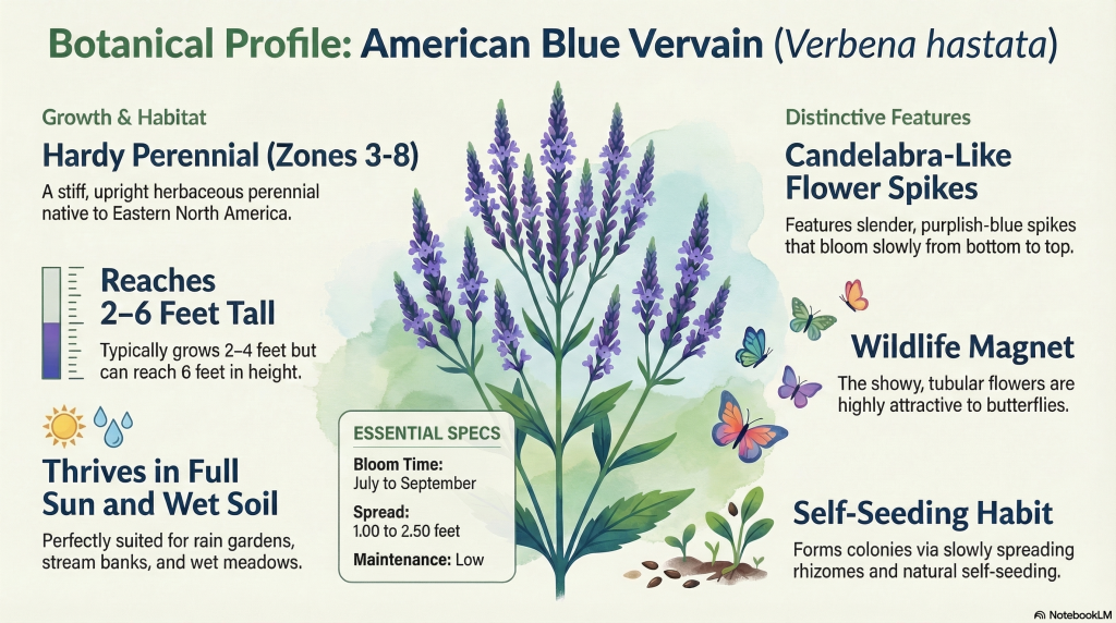 Noteworthy Characteristics: Verbena hastata, commonly called blue vervain, is a native perennial which commonly occurs in wet meadows, wet river bottomlands, stream banks, slough peripheries, fields and waste areas throughout the State except for the Ozark region where it is uncommon (Steyermark). It is a rough, clump-forming perennial with a stiff, upright habit which typically grows 2-4′ tall (less frequently to 6′) on square hairy stems which typically branch above. Features candelabra-like inflorescences of erect, slender, pencil-like spikes (2-6″ long) of tiny, tubular, 5-lobed, densely-packed, purplish-blue flowers (1/8″ wide) which appear over a long July-September bloom period. Flowers on each spike bloom bottom to top, only a few at a time. Lance-shaped, sharply toothed, green leaves (to 6″ long).