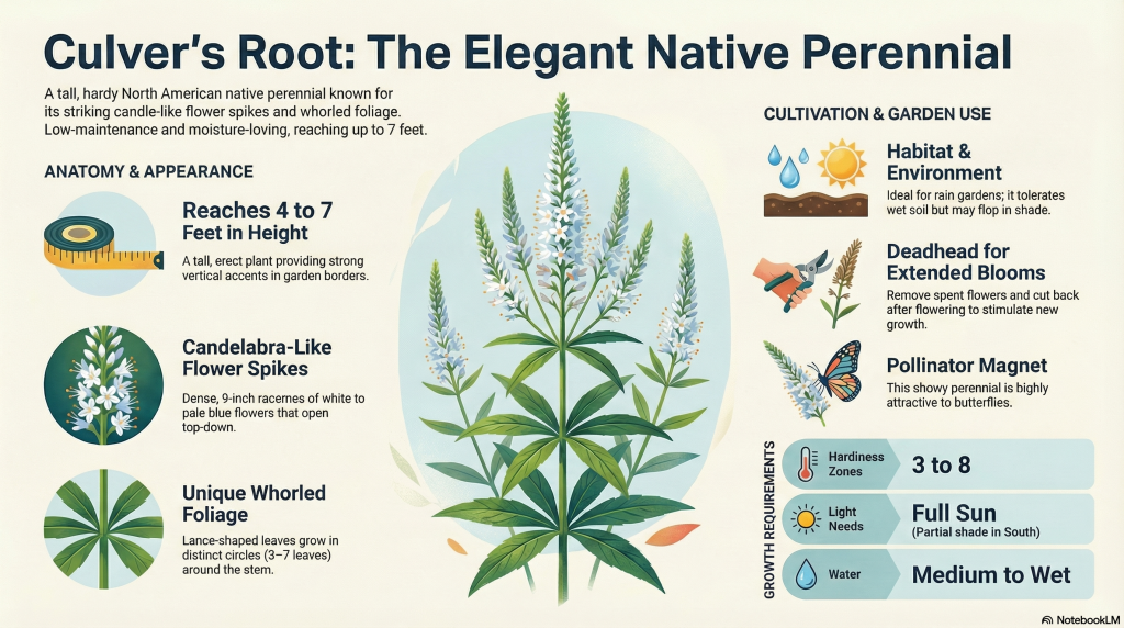 Noteworthy Characteristics: Veronicastrum virginicum, commonly called Culver’s root, is a large, erect, Missouri native perennial which occurs in open woods, thickets and moist meadows and prairies throughout the State. Typically reaches 3-7′ tall when in bloom. Resembles a large veronica, except its lance-shaped leaves are in whorls (3-7 leaves per whorl) on the stems rather than opposite. Dense, slender, 9″ long spikes (racemes) of tiny, tube-like, white to pale blue flowers open from the top down in late spring to early summer atop strong, upright stems. Bloom can extend well into the summer. Smaller, branching, erect, lateral racemes give plant a candelabra-like effect when in full bloom. Root has been used medicinally as a cathartic.