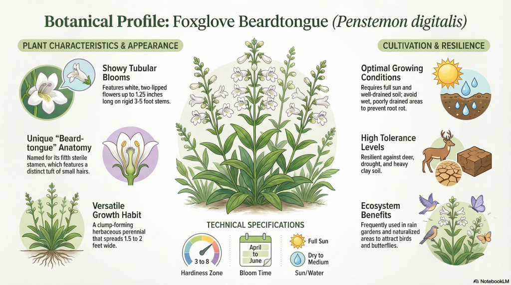 Noteworthy Characteristics: Penstemon digitalis is a clump-forming, -native perennial which typically grows 3-5′ tall and occurs in prairies, fields, wood margins, open woods and along railroad tracks. Features white, two-lipped, tubular flowers (to 1.25″ long) borne in panicles atop erect, rigid stems. Flowers bloom mid-spring to early summer. Basal leaves are elliptic and stem leaves are lance-shaped to oblong.