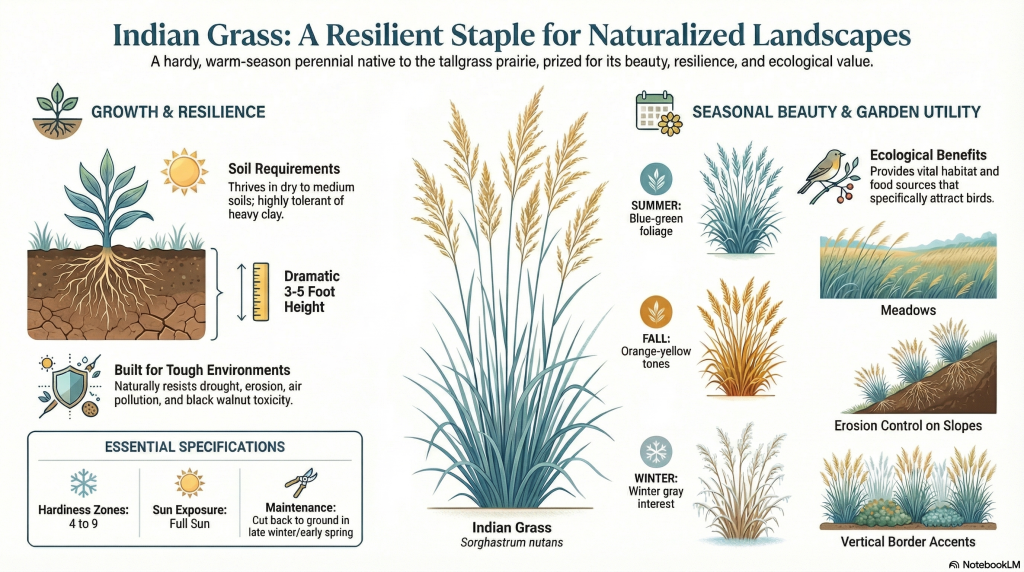 Noteworthy Characteristics: Sorghastrum nutans, commonly called Indian grass, is a warm season Missouri native perennial grass which typically occurs in prairies, glades and open woods throughout the State. It was one of the dominant grasses of the tallgrass prairie which once covered large parts of the Midwest. Typically grows 3-5′ tall (less frequently to 6′) and is noted for its upright form and blue-green foliage. It forms upright clumps (to 2-3′ tall) of slender, blue-green leaves (to 1/2″ wide and 2′ long). Foliage turns orange-yellow in fall and usually retains hints of color into the winter. Stiff, vertical flowering stems, topped with narrow, feathery, light brown flower panicles (to 12″ long) highlighted with yellow stamens, rise well above the foliage clump in late summer to 5-6′ tall. Panicles darken to bronze/chestnut brown in fall as they mature, later fading to gray. Panicles continue to provide some interest well into winter.