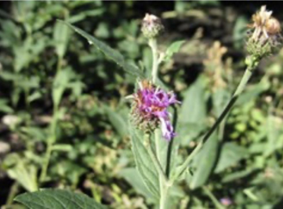 A member of the Sunflower family (Asteraceae), Missouri Ironweed blooms late summer to early fall. It is a great way to attract pollinators because it serves as a late-season nectar source. The caterpillars of some moths feed on Ironweed species, including Grammia parthenice (Parthenice Tiger Moth), Perigea xanthioides (Red Groundling), and Papaipema cerussata (Ironweed Borer Moth). Like milkweeds (Asclepias spp.), ironweeds (Vernonia spp.) are bitter to the taste, so herbivorous animals like deer and cattle will avoid consuming it.