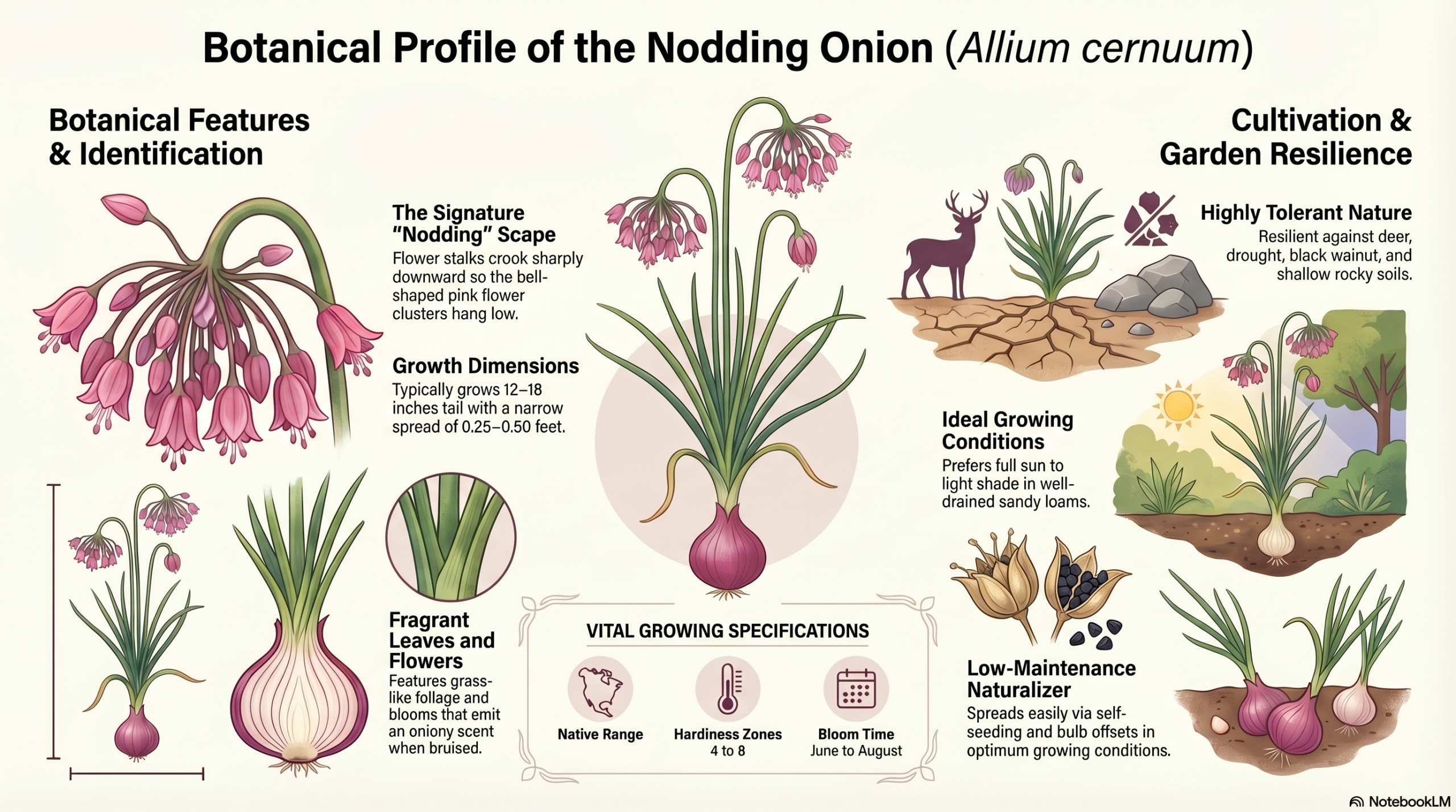 Nodding Onion is stunning to have in gardens because of its unique flowers. A ball of star-like flowers forms on each stem, tending to bend downward; hence the name “nodding” onion. The nodding habit may also protect the nectar from rain.