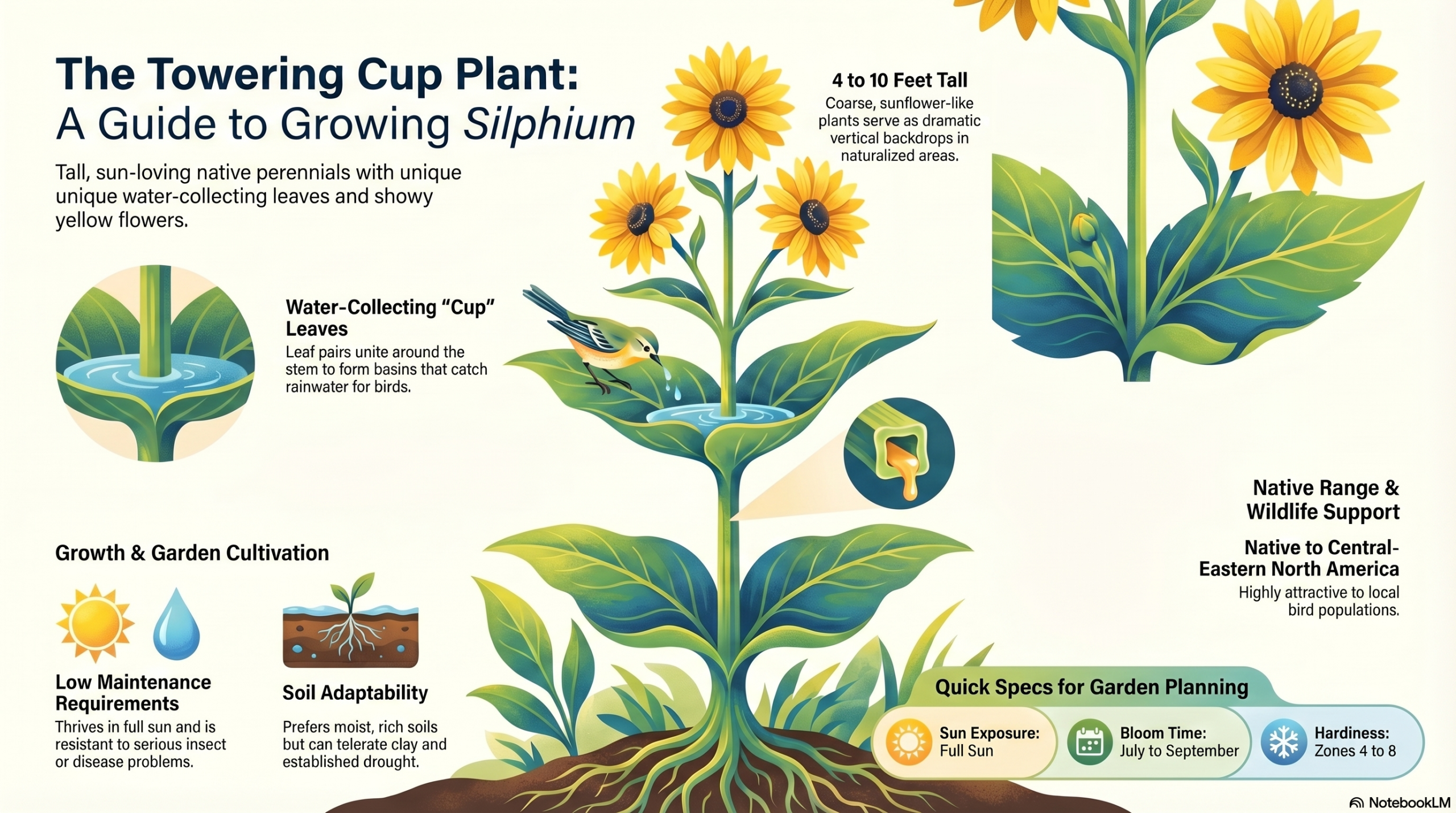 Noteworthy Characteristics: Silphium perfoliatum, commonly called cup plant, is a coarse, sunflower-like,  native plant which occurs in low woods and thickets, meadows, prairie stream/pond peripheries and along railroad tracks throughout the State. It typically grows on tough, erect stems to 4-8′ tall and is distinguished from the other silphiums by its square/quadrangular stems and pairs of cup-forming leaves. Flower heads (to 3″ diameter) featuring light yellow rays (20-40) and darker yellow center disks bloom in summer on the upper part of the plant. Rough, triangular to ovate, coarsely-toothed, opposite, connate-perfoliate, medium green leaves. Lower leaves (to 14″ long) are united at the petioles. Middle and upper leaves lack petioles, and leaf pairs are united at the bases to envelop the stem forming a cup (hence the common name). Leaf cups will collect rain water. This species is also commonly called cup rosin weed because its stems (like those of all silphiums) exude a gummy sap when broken or cut.) The genus name Silphium comes from the Greek name silphion, used to refer to a North African resin bearing plant.Specific epithet means with leaves surrounding or embracing the stem, which form the “cup” in this species.
