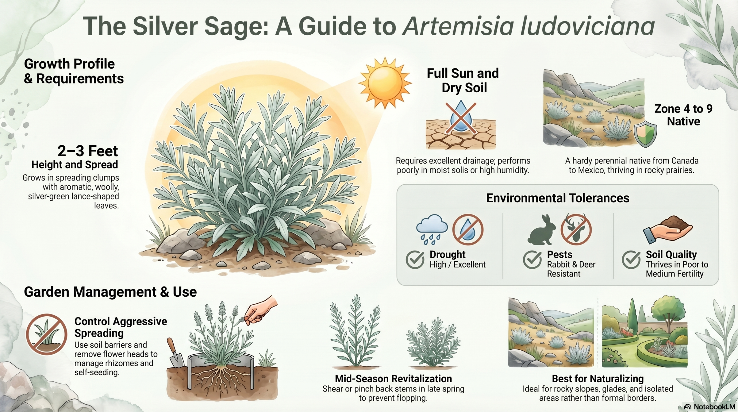 Noteworthy Characteristics: Artemisia ludoviciana is native throughout North America from Canada to Mexico. In Missouri, it is typically found growing on rocky prairies, glades, bluff escarpments, open wooded slopes, waste ground, along roads and railroads primarily in the northern and western parts of the State (Steyermark). It is commonly called white sage because of the appearance of its foliage. This is an erect, rhizomatous, somewhat weedy, herbaceous perennial that grows in spreading clumps to 2-3′ (less frequently to 4′) tall on greenish white stems clad with aromatic, sage-like, lance-shaped leaves (to 2-4″ long) that are white woolly beneath and nearly glabrous above. Foliage adds texture and contrast to gardens. Tiny, somewhat inconspicuous, yellowish-gray, discoid flower heads (rays absent) appear in dense panicles at the stem ends in summer. Flowers have little ornamental value. Flowers give way to dry achenes. Foliage is aromatic when bruised.