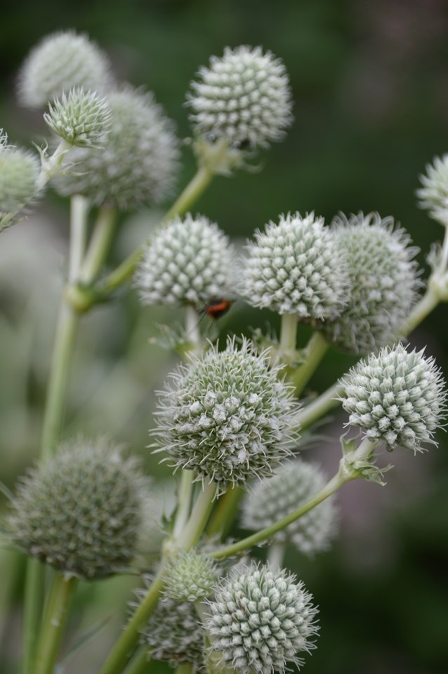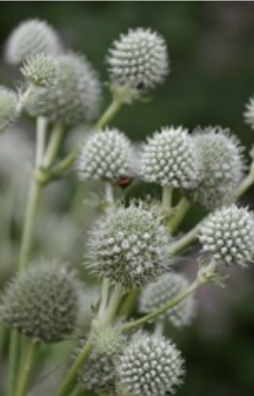 Eryngium yuccifolium (Rattlesnake Master) matures to a height of 4′ and has white “bristly” flowers. These bristly flowers and coarse leaves make it largely ignored by deer and rabbits. It is a member of the carrot/parsley (Apiaceae) family, but is very different-looking from the usual umbel flowers and fine-cut foliage of plants in this family. It is typically found in medium-wet to medium-dry soils and prefers sites with full sun. Although not a butterfly or bumblebee magnet, small native bees, moths and flies will nectar on Rattlesnake Master. The latin name, Eryngium yuccifolium, comes from the fact that the leaves look very much like a Yucca plant. Other common names include Button Snakeroot, Yucca-leaf Eryngo, Corn Snakeroot, Water-eryngo, Rattlesnake Flag, and Rattlesnake Weed.