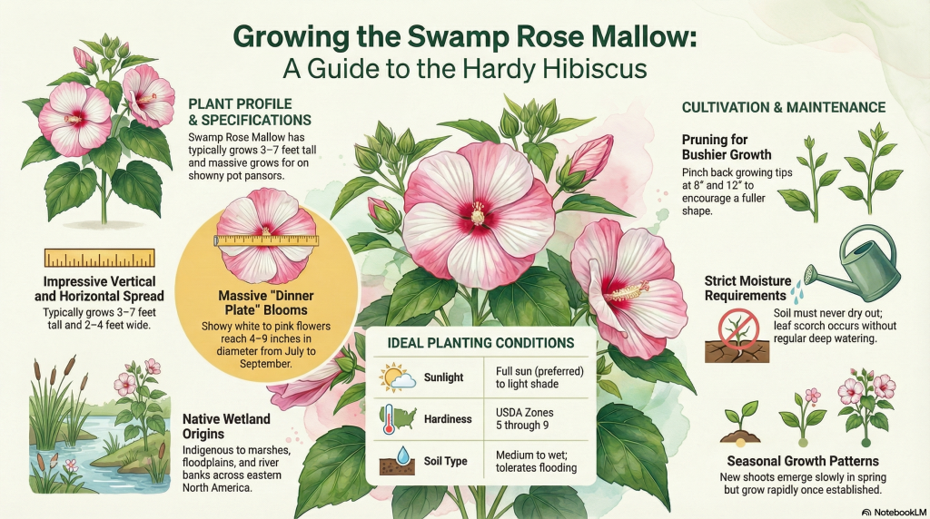 Noteworthy Characteristics: Hibiscus moscheutos, commonly known as hardy hibiscus or swamp rose mallow, is a vigorous, sturdy, rounded, somewhat shrubby, hairy-stemmed, woody-based perennial of the mallow family. It typically grows to 3-7’ tall and to 2-4’ wide. It is native to wet spots (marshes, swamps, floodplains, river banks, moist meadows, and moist woods) from Ontario and Massachusetts south to Ohio, Indiana, Alabama and Florida. Showy, dinner plate-sized, hollyhock-like flowers (each to 4-6” diameter) have five overlapping white, creamy white or pink petals with reddish-purple to dark crimson bases which form a sharply contrasting central eye. Each flower has a prominent and showy central staminal column of white to pale yellow anthers surrounding an even longer style. Individual flowers last only 1-2 days, but new flowers open each day in rapid succession over a long July to September bloom period. At the peak of bloom, a large plant can produce 20 or more flowers per day. Flowers (to 6-9” wide) are among the largest flowers produced by any perennial that is winter hardy to the St. Louis area. The blooms are attractive to butterflies and other pollinators. Alternate, broad-ovate to lanceolate leaves (3-8” long) with toothed margins are green above and white-hairy beneath. Leaves are lobeless or have 3-5 shallow lobes. Seed capsules will float on water which facilitates seed dispersal. Genus name is the old Greek and Latin name for mallow. Specific epithet from Latin means musk-scented.