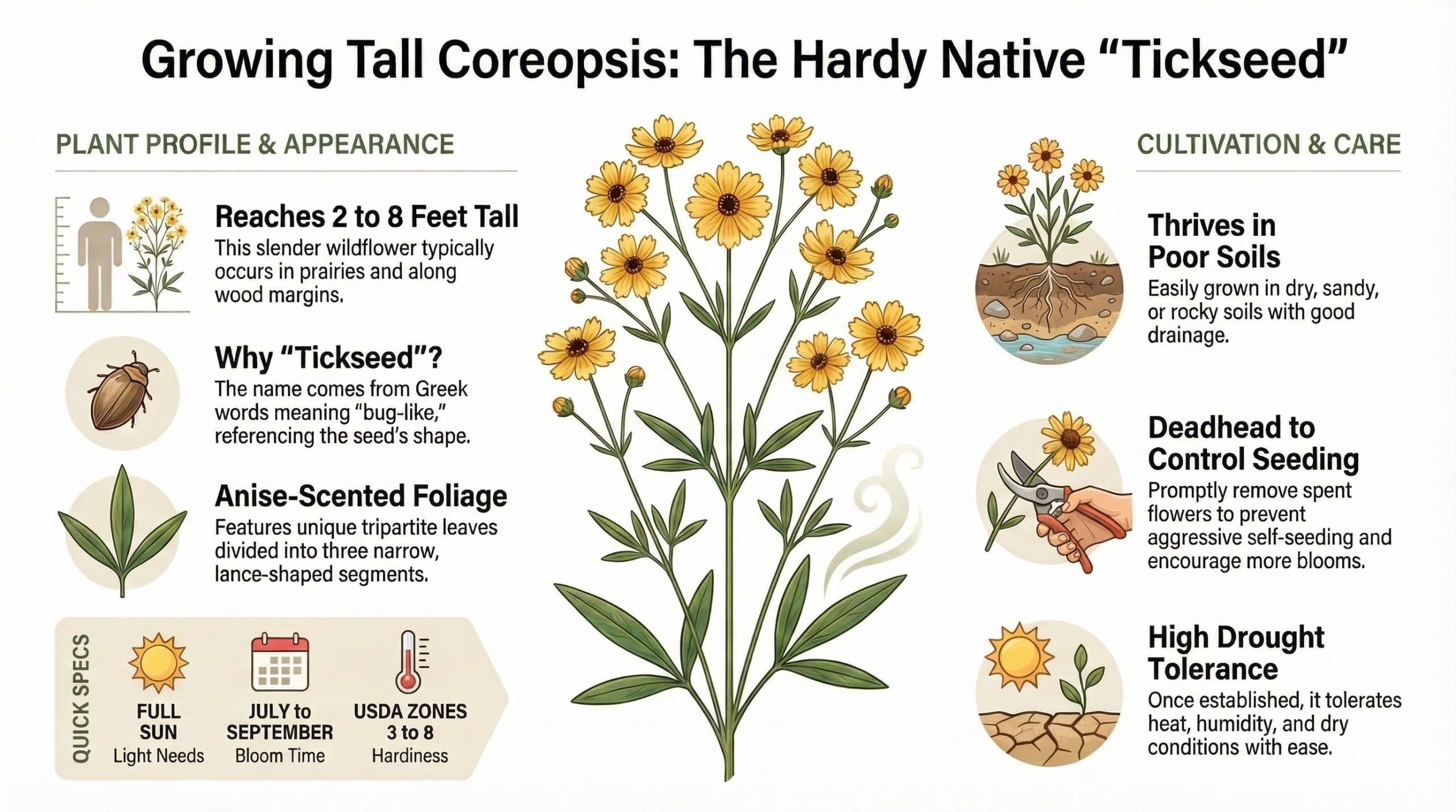 The genus name comes from the Greek words koris meaning “bug” and opsis meaning “like” in reference to the shape of the seed which resembles a bug or tick. Specific epithet refers to the leaves being divided into three narrow lance-shaped segments. Plants in the genus Coreopsis are sometimes commonly called tickseed in reference to the resemblance of the seeds to ticks.