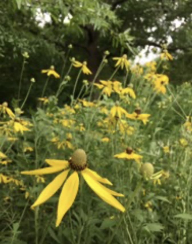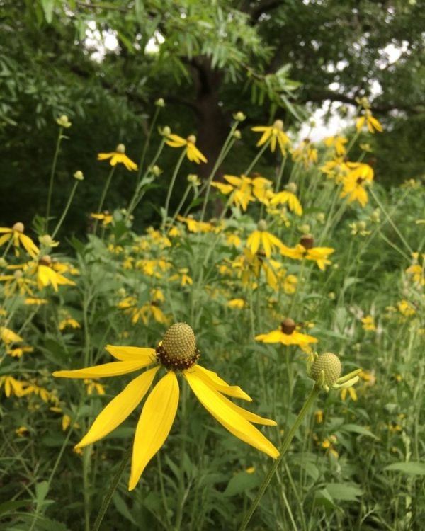 Yellow Coneflower is native to dry prairies and savannas. It has stiff and rough-feeling coarse leaves, and showy yellow flowers which have droopy soft yellow rays. The cone-like green centers eventually change to a dark purple or brown. Many insects are attracted to this plant such as butterflies and bees. It grows and transplants very easily, is drought-tolerant, and makes an excellent cut flower. Yellow Coneflower grows best in full sun to partial shade, and medium to dry medium soil conditions. It blooms approximately from July to September. There are many good native companions for Ratibida pinnata blooming at the same time such as Wild Bergamot, Anise Hyssop, and many of the prairie grasses. Other common names are Drooping Coneflower, Pinnate Prairie Coneflower, Weary Susan, Grayhead Coneflower and Grey-headed Coneflower.